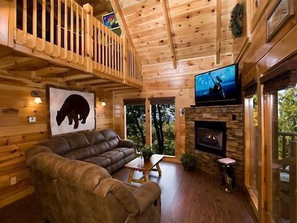 Il soggiorno vanta soffitti a cattedrale e vetro da parete a parete per ammirare lo splendido paesaggio di montagna insieme a un grande televisore HD con lettore DVD, un camino elettrico in pietra sovrapposto per una serata fredda o romantica e una comoda sezione con un divano letto.