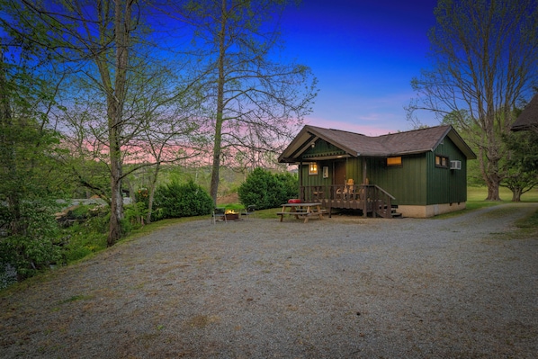 This particular cabin is located on the Little Pigeon River where you can hear the captivating sounds of the river from your cabin. The cabin features one studio style bedroom with a king-size bed and full kitchen and dining area and one private bathroom. From Shady Brook you are within walking distance of the Greenbrier entrance to the Great Smoky Mountains National Park, just a few miles from Gatlinburg city limits, and minutes away from downtown Gatlinburg.