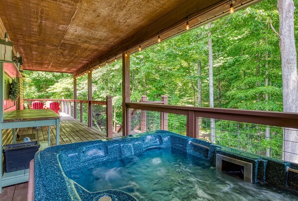 Cabin w/large deck overlooking mountain stream, hot tub, multicade, fire pit!