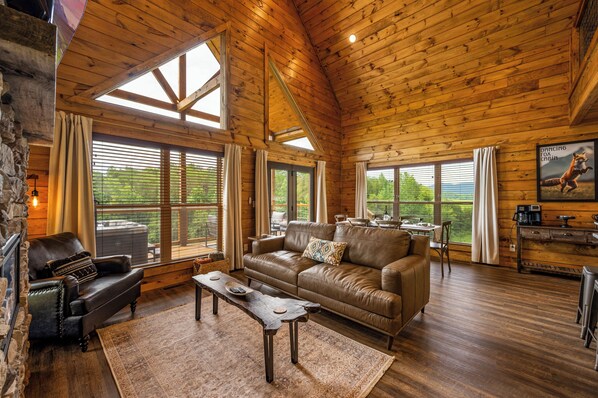 The living room features plush seating options, centered around a floor-to-ceiling stone fireplace, complete with a live-edge coffee table, an electric fireplace, and a 55” TV mounted above, making for a cozy gathering spot and providing entertainment for nights indoors.