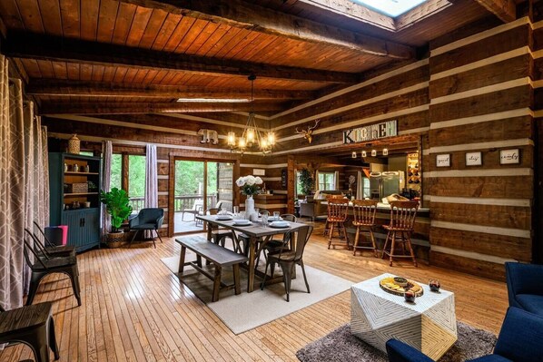 The main living area features a cozy seasonal stone fireplace and a premium Bose sound system for movie nights. The modern-rustic kitchen is fully equipped for all your culinary needs and overlooks the peaceful creek.