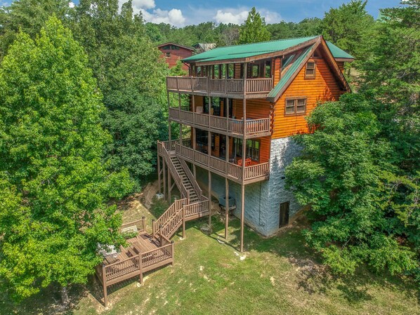 There are 3 large bedrooms, one on each level, and each with their own bathroom. The children will be fighting over who gets to sleep in the queen-over-queen log bunk bed in the downstairs game room, which makes a total of 5 beds, and sleeps 10 comfortably. The master on the top level includes a king-sized bed with jacuzzi tub. The highlight of the master on the top level is the door out to the porch with your own rocking chairs. The master on the main level also features a king-sized bed with reading nook. The bedroom on the bottom floor is off the game room. It features a queen-sized bed with memory foam mattress. Each bedroom is equipped with its own TV.