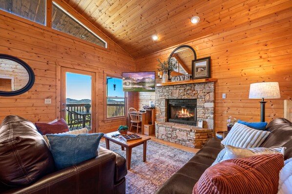 Located on the main level of Love the View is a fully equipped kitchen and dining area with enough seating for 6. Keurig coffee machine (pods not provided) and regular coffee pot (coffee and filters provided) available. The cozy living room provides you and your guests with leather couches to watch your favorite shows, free wifi, or enjoying the gas fireplace on those chiller nights (Fireplace is seasonal and will be turned off May 1 to Sept 30th). Also, on the main level is a king size bedroom with a flat screen tv with an adjoining bathroom with a large jacuzzi tub and shower.
