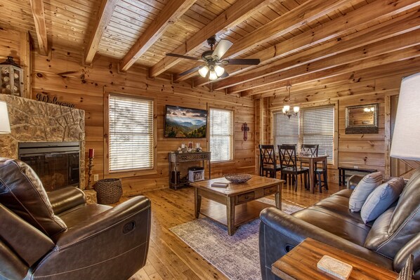 Main level offers a semi open concept with kitchen, dining & living room. Gas fireplace & Flat screen TV. Off of the Livingroom is a bedroom with king bed and large jacuzzi jet tub in bathroom. Upstairs offers a large game room with pool table and a cabinet full of games to play and twin bunks. Off from the loft game room area is a king bed with full bath. Hot tub is located on outside main level deck w/the privacy anyone can enjoy. The upper deck has views you can see for miles while reading a book in the swing or rocker. Outside the cabin, you can enjoy a relaxing evening by the fire pit.