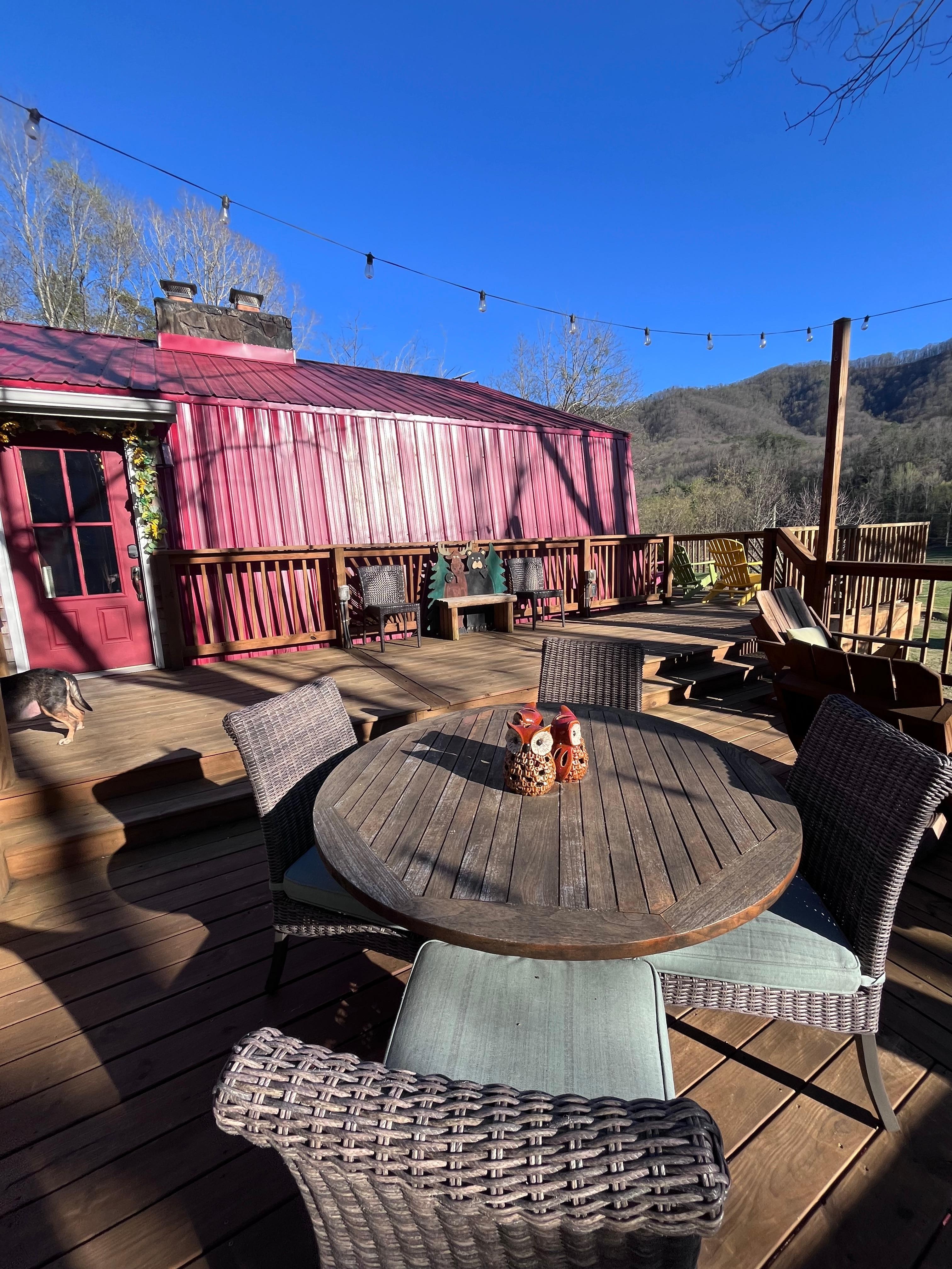 Lights in the trees twinkle above the huge deck making this space magical. It has plenty of room to share meals, swap tall tales, and toss beanbags while playing the cornhole game or relaxing in the large hot tub. The propane BBQ grill is right outside the dining room sliding glass door for your convenience. And of course there is plenty of Adirondack chairs to chill out and enjoy the mountain views. The firepit is circled with wooden Adirondack chairs so everyone is comfy while spending time around the campfire. (Check out photos of the deck and firepit.)