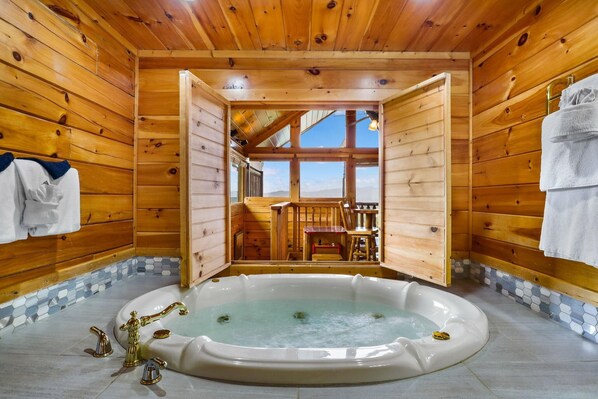 Questa cabina è arredata con Aspen Log Furniture. Questa cabina offre sia una vasca idromassaggio interna che una vasca idromassaggio all'aperto per il divertimento delle coppie. Potrai rilassarti con 2 caminetti e TV a grande schermo. Dal ponte, goditi una vista mozzafiato mentre sei seduto sulle nostre comode sedie a dondolo. Per il vostro divertimento, questa cabina è dotata di tavolo da biliardo e classico sistema di videogiochi arcade.