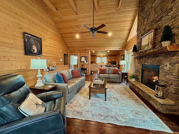 Bella cabina nuova di zecca con vista sulle montagne! Tre camere da letto con letti King, bagno privato e TV via cavo. Cucina completamente attrezzata, soggiorno con camino a gas, TV via cavo e WiFi. Vasca idromassaggio, sedie a dondolo e grill sul ponte posteriore si affacciano splendide viste sulle montagne. Grande camera da letto al piano di sotto ha letti a castello (doppia / piena) (4a camera da letto è aperta in den con letti a castello), bagno privato, grande schermo piatto con audio surround, air hockey da tavolo, biliardino, biliardo, videogiochi arcade e carta tavolo.