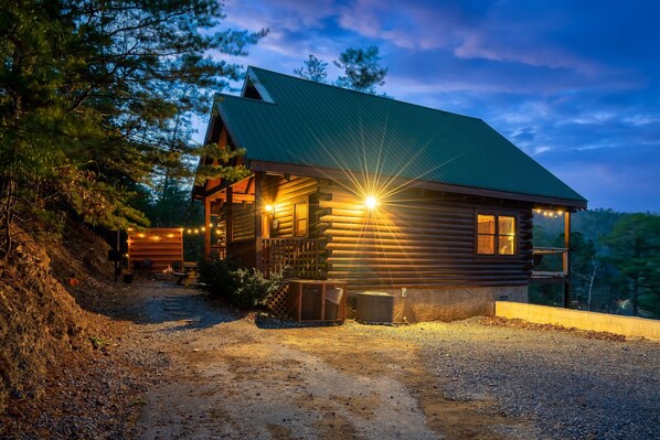 Welcome to your new favorite Cabin retreat. - - - On arrival you'll find free, flat parking for 2 vehicles. You'll immediately notice an overlook of the valley below from the curbed edge retaining wall parking area. - - - Before entering the cabin you will see the outdoor activity area for cooking at the heavy duty charcoal grill, picnic table for enjoying your cooked meals, and the firepit for stories, songs, and smores! - - - The covered front porch hosts your entrance into this log cabin. You will be given your own door code before arrival to use for the duration of your stay. - - - At first you will notice the kitchen and dining area which will greet you as you walk in. Your eyes are sure to scan straight ahead to the windows of the back patio area where you'll take in the views of the country side of lush geens from spring to summer, beautiful warm colors in the fall, and a winter wonderland until the next spring. The back patio is awesome for taking relaxing dips in the hot-tub with a calming view. - - - Back inside, you'll catch the living room complete with a gas fireplace, 55" Roku Tv to connect your own streaming channel subscriptions to watch your favorite shows, and the couch by day and queen size bed by night. - - - Bring your bags into the master suite for your special occasion. In the suite you may find the most relaxing portion of your trip. If travels have made you groggy, hiking has your muscles sore, or attractions and shopping has you flat wore out, stay indoors and enjoy your view from the soaking tub in suite. If you've still got some life in you and want to take a shower instead, you'll find the full bathroom( with a starter kit of soaps and shampoo) ,also within the master suite on the opposite side of the soaking tub. - - - Head up the spiral staircase for fun and games. Be sure to post your pic and tag us, plus hashtag #AdventureTogether at our insta-worthy green wall and custom cabin name sign. Get in your best shots at a few games of pool, or try your hand at the stand up multi-cade vintage arcade game system. - - - While in the upstairs loft, one of your guests may also prefer to sleep on the futon. - - - At the end of your day you're sure to enjoy the restful, relaxing King size bed back in the master suite. Don't worry, if you like to watch TV in bed you've got that option with a 43" Roku Tv for viewing your favorite streaming apps. - - - When you wake up you'll be greeted by light from the sunrise through every window. - - - We make sure that you have a starter fill of coffee pods for the kuerig. - - - We try our best to make sure that the most common items are stocked for our guests in this comfy kitchen. - - - When you need to wash clothing, you'll notice the stacked washer and dryer unit in the small laundry room near the entrance of the cabin.