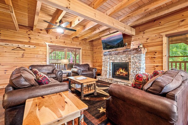 The cozy living room is the perfect spot to enjoy some quality time with family and friends. This room features a stone gas fireplace, a sofa, a love seat, and large flat-screen TV.