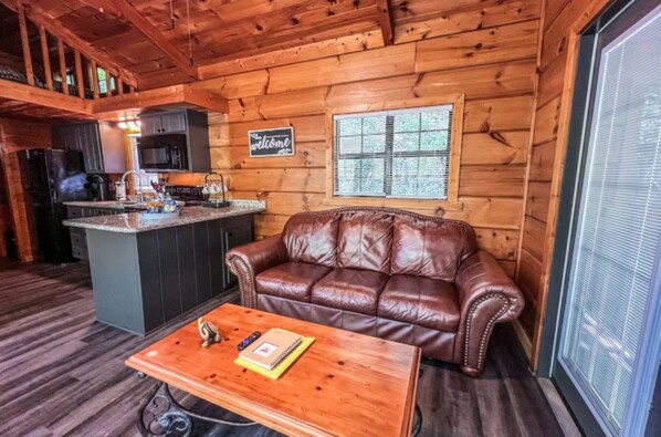 As you enter in the cabin, you have a comfortable living space with a 55" Smart TV, so feel free to log in to your favorite apps for that movie you have been wanting to watch.