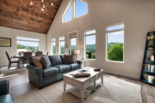Inside, cathedral ceilings and large windows flood the space with natural light and mountain vistas. The cozy yet modern interior features high-end furnishings, a sleek electric fireplace with a 65” Smart TV, and a leather sofa perfect for movie nights or quiet conversation.