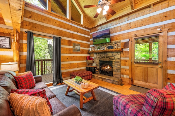 La cabina ha un letto matrimoniale al piano principale, un letto matrimoniale nel soppalco al piano superiore e due letti a castello nella sala giochi del soppalco, quindi può ospitare fino a 6 persone. Nel loft puoi anche goderti una partita a biliardo! Il portico avvolgente offre molto spazio per godersi la vita all'aria aperta. Fai un tuffo nella vasca idromassaggio, goditi una tazza di caffè sulle sedie a dondolo, gioca a biliardino o cenare sul tavolo da picnic anziché all'interno! TV a schermo piatto con cavo (140 canali, Netflix (BYO Netflix), WiFi ad alta velocità e tanti giochi per famiglie!