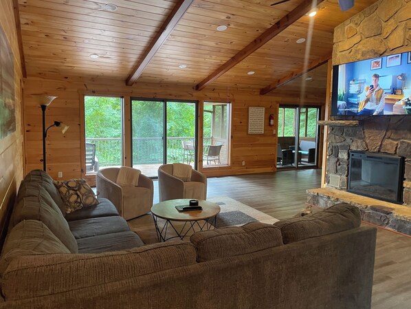 No stairs entry, 2 small steps to front door and full set of stairs to use lower level. Cabin is not handicap friendly. The main level of the cabin is without the use of stairs making it ideal for those who have difficulty with stairs. The main floor of this cabin has a fully equipped kitchen, dining room, 2 bathrooms, 3 bedrooms - master bedroom with 55” smart TV and computer desk/chair, 2 other bedrooms also with 55” smart TV’s. Living room with 70" Smart TV, screened patio and deck.