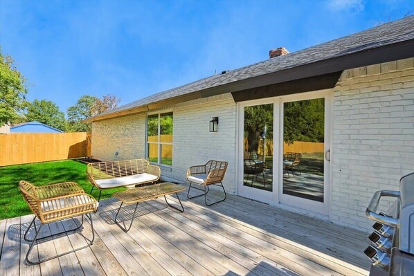 Slide open the living room’s glass patio doors and step into this spacious backyard. Enjoy your morning coffee or afternoon happy hour drinks on this wooden deck as you soak in Texas’ warm weather. The outdoor patio set even comes with tiki torches so you can enjoy your beverages late into the night. Feel free to roam, play, or roll in the plentiful green grass available as well!