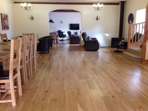 2 piani con tutte le camere da letto su scale. Tutti i piani al piano terra sono dotati di riscaldamento a pavimento. Tutto il piano aperto. Grande cucina completamente attrezzata, lavastoviglie x 2, frigorifero / congelatore americano, grande frigorifero per il vino, fornello elettrico, pentole, padelle e piatti / utensili da cucina, stoviglie e bicchieri, bicchieri in plastica per esterni, microonde, tostapane, lavatrice, asciugatrice Asciugatrice, asse da stiro e ferro da stiro, cesto della biancheria, scopa, cestello per la polvere e spazzola, stendibiancheria per interni, aspirapolvere, tavolo da pranzo e 4 sedie. Giù per le scale, toilette, lavandino. Attraverso la zona pranzo con tavolo da pranzo e sedie per 12, bruciatore di legno con divano in pelle a 2 posti e poltrona reclinabile in pelle. 4 x sedie con vasca e tavolino. Soggiorno 3 divani in pelle a 3 posti, divano in pelle da 1 x 2 posti, tavolino, TV / DVD a schermo piatto, radio, lettore CD con docking station, tavolo da biliardo, 2 sedie a sdraio. Portando a scendere le scale doccia, wc e lavandino. Grande sauna interna. Patio privato, vasca idromassaggio, tavolo da giardino e sedie, area prendisole privata, lavabo rotante / pegs. BBQ / attrezzi disponibili.