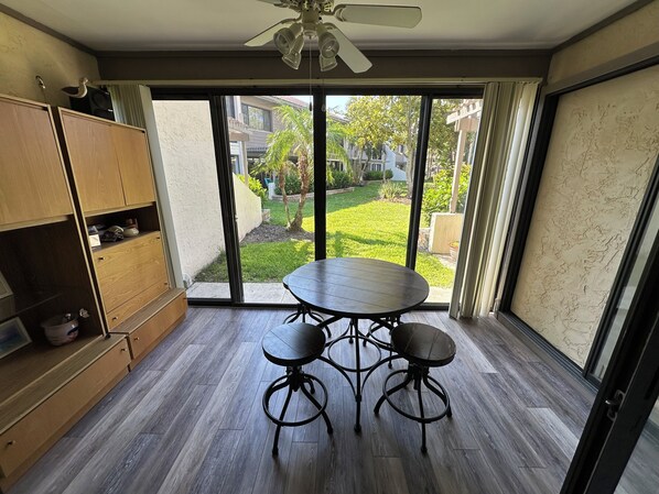 I colori solari di Siesta Key sono l'ispirazione per questa rilassante unità da giardino al 1 ° piano. Il lanai vetrato offre l'accesso diretto al giardino e al patio esterno. L'unità ha una sensazione pulita e aggiornata. La camera da letto principale ha 2 letti queen size e la camera degli ospiti ha 2 gemelli. I servizi includono 3 TV a schermo piatto (New 58 pollici TV in salotto), lettore DVD, stereo disponibile, moquette e pavimenti piastrellati, accesso wireless a Internet e lavatrice e asciugatrice
