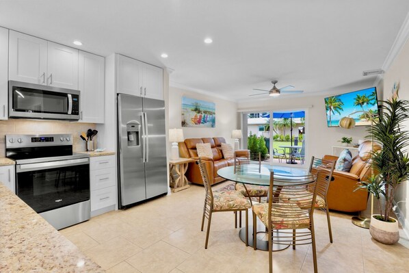 Inside, Unit 003 features a newly refreshed and updated interior designed for comfort and ease. The open living area includes cozy seating, a TV for relaxing after beach days, and sliding doors that bring in natural light from the garden setting. The fully equipped kitchen includes essential appliances, cookware, and dining space so you can prepare meals at home or enjoy takeout from Siesta Key’s popular local restaurants.