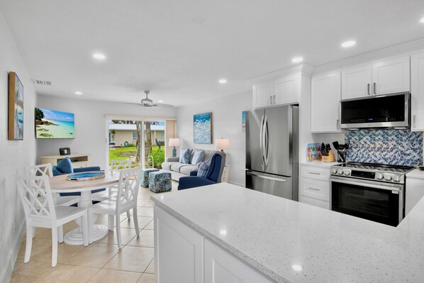 This updated condo features warm coastal decor, porcelain tile flooring, and a bright open layout. The living room includes a plush sofa, smart TV, and sliding doors that open to the private patio, perfect for morning coffee or evening relaxation. The modern kitchen offers maple cabinetry, granite countertops, and stainless-steel appliances, plus a Keurig coffeemaker for your morning brew. Gather for meals in the dining area or enjoy a casual breakfast at the kitchen bar.