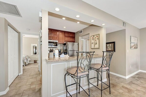 This recently updated 3rd-floor unit features tropical decor throughout, creating a relaxed island atmosphere. The spacious living area offers a cozy retreat, perfect for unwinding after a day in the sun. Enjoy meals at the dining table or prepare delicious dishes in the fully equipped kitchen, complete with modern appliances for your convenience. Step out onto your screened-in lanai, where a dining table offers scenic views of the Intracoastal Waterway—perfect for enjoying morning coffee or evening dinners while keeping an eye out for dolphins and manatees.