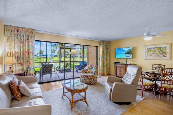 This lushly landscaped property spans 14 acres, providing a peaceful retreat with the beach community's amenities at your fingertips. The attractively decorated 2-bedroom, 2-bathroom condo on the first floor boasts an inviting ambiance with a large screened lanai that overlooks the picturesque Intracoastal Waterway, making it perfect for relaxation.