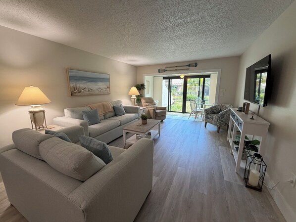 Il soggiorno ha un sacco di comodi posti a sedere così come un grande televisore e DVD. La nostra area coperta di lanai, solo un gradino più in basso, aggiunge ulteriore spazio abitativo. Ha un piccolo tavolo da colazione in rattan e sedie e una scrivania e si affaccia sul giardino tropicale. Queste porte del patio conducono al cortile e alla nostra area coperta privata di lanai.
