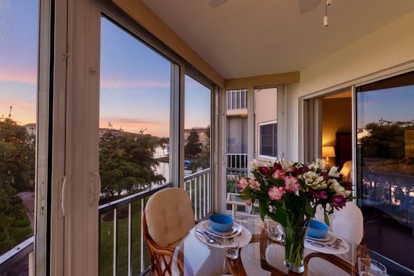 - Lanai dining with canal views