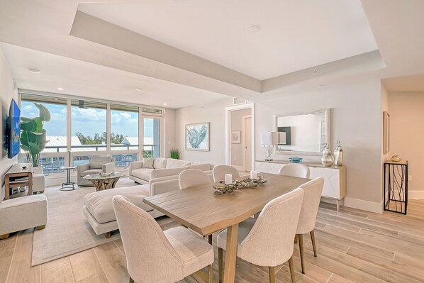 This spacious three-bedroom, three and a half-bath residence will delight your senses with its elegant, understated color palette accented by natural wood and stone. The open floor plan is anchored by a gourmet kitchen with dramatic quartz-topped island that opens into a spacious dining and living area. The great room leads out to a private covered terrace that faces east with lush views of Siesta Key. The master suite offers king-sized bed, flat-screen tv, walk-in closet and spa-like bath with private toilet and expansive shower. Two additional bedrooms, one with a queen bed and the other with a king, each with flatscreen televisions and ensuite bathrooms, offer luxurious accommodations for your whole group. Offering the perfect combination of luxury and family-oriented functionality, this vacation property is the ideal place to recharge and unwind in a truly incomparable setting.