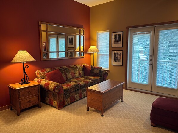 A Place Yu Will Love! This quiet, top floor studio condo is a gem for a small family vacation or romantic couples escape at Silver Star Mountain. The view can’t be beat with the mountain-facing windows. The unique high ceiling and the rare deck off the living area with french doors, makes this condo bright and cozy.
