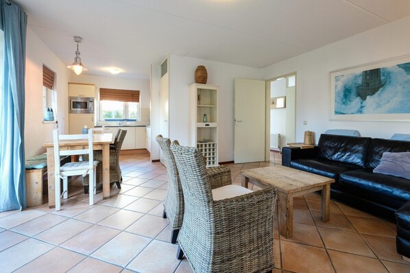 The living room is tastefully furnished with 1 sofa and 2 chairs. There is a cable TV with Dutch and German channels. The dining room has a spacious dining table with 6 chairs. A high chair is available in the accommodation.