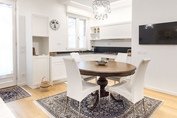 Ingresso indipendente sulla corte privata attrezzata con tavolo e sedie - ampio soggiorno con divano-letto singolo, tavolo da pranzo ed angolo cottura con lavastoviglie - bagno di servizio – camera matrimoniale - bagno con box doccia. Posto auto privato e riservato. Servizio wi-fi disponibile. Aria condizionata in zona giorno. Animali non ammessi.