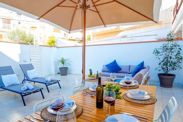 Relax on the private patio/terrace , an idyllic spot where you can unwind after a day at the beach. Here you'll find sun loungers and a large sofa to enjoy the outdoors. Fancy a barbecue? There's everything you need to prepare a barbecue and a large table to share meals with friends and family .