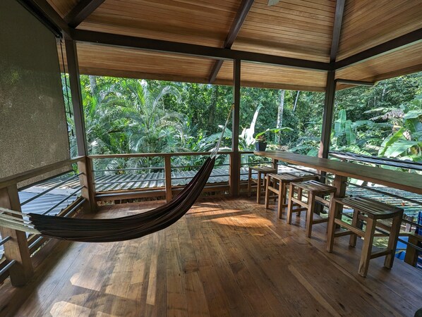 A 20 foot container has 1 wall knocked out to expand the size of the bedroom. The bathroom is an add-on room off the back of the container which has natural stone tile throughout. The bathroom sink has a live edge wood pedestal (found on the farm). The container doors open up to the heliconia garden. There is a desk inside the cabin with a view of the garden. There is a trundle bed with a queen size mattress for an additional person. The open air kitchen is on the second level. There is a 2 burner induction stove, air fryer/toaster oven, blender, coffee maker, and refrigerator. There is a hot/cold water dispenser supplied with spring water. There is also a breakfast bar, a hammock. and sofa on the second level. The cabin is surrounded in trees and a small river so it is a lovely spot to relax and experience life on a jungle farm.
