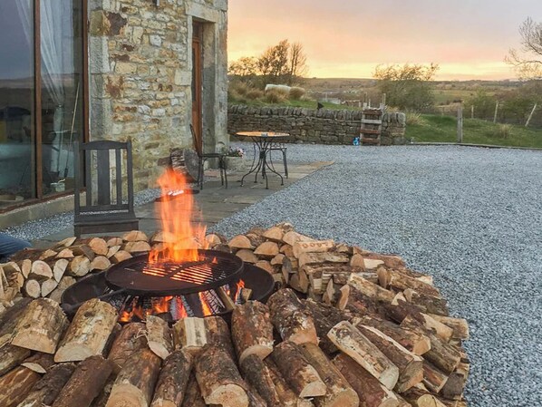 Bathroom: Bath With Shower Attachment, Toilet. Ground source underfloor central heating, electricity, bed linen, towels, Wi-Fi and wood for wood burner and hot tub included. Welcome pack. Enclosed lawned garden with patio, garden furniture, firepit and pizza oven. Wood fired hot tub for 5 (private). 8½ acre grounds with seasonal pond. Bike store. Private parking for 5 cars. No smoking. Please note: There is a seasonal pond in the grounds, 30 yards. The property has a natural water supply from a borehole. Sorry, no hen or stag parties. Families and couples only.. Hidden down a private farm track in the middle of the Forest of Bowland, Boococks Barn offers a truly unique and special stay. Set in 8½ acres of its own land, you’ll feel like the only people in the world when you stay here, with your only neighbours being the local highland cattle, deer and hares lolloping through the meadows. The feeling of being secluded in its own acres is magnified by its self-sufficiency; ground sourced heat warming the two floors on individual room dials, spring water from the private borehole and a Swedish hot tub, fired by locally sourced wood. It’s an ultimate get away from it all. Every aspect of this beautiful barn conversion has been thoughtfully designed to make the most of the scenic surroundings. The 180 degree view from the barn has to seen to be believed and is revealed descending the track to the property. It starts at Whernside in the Yorkshire Dales, followed by the contour of Ingleborough, capped in the southern extreme by Pendle Hill. To the back of the barn a large, light filled kitchen with a dining table in the centre is the perfect focal point to sit and chat over dinner. There is a double bedroom and shower room which is ideally located close to the garden so you can hop in and out of the hot tub. Upstairs, there are a further three bedrooms, two of which are kingsize, plus an en-suite showeroom and a family bathroom. The pièce de résistance is the living room, which takes up the front of the barn with a magnificent two storey window showcasing uninterrupted views over the Ribble Valley and Yorkshire Dales from both floors. The main living area is divided into two by a lavish double sided fireplace creating a bright and open social space and a cosy nook which is perfect for snuggling up with a book. Outside, the owners have installed an eco friendly, Swedish wood fired hot tub nestled in a corner of the garden which is perfectly positioned to make the most of the gorgeous vistas from sunrise through to sunset. You’ll also find a pizza oven and hand built firepit to cosy up next to while you gaze at the stars on a balmy summers evening.