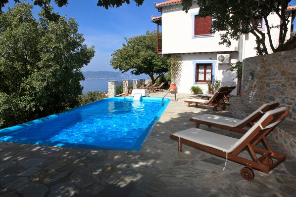 The house is spacious and very comfortable, with a stunning sea view and an enjoyable swimming pool. We had very pleasant breakfast and lunch at the shadow of a big tree, watching at the sea and enjoying wonderful sunset from the terrace. The kitchen is basically furnished, the rooms and the entire house is well ventilated and fresh. The house seems to be recently renewed, respecting the traditional skopelos style. I think the car is necessary, as the house is at the top of a hill and the road is quite ripid. The village of Glossa is reachable by car in few minutes and this part of the island seems to be more quiet. The only problem for us was to leave the house the morning with its swimming pool to go to the sea, as we stayed so well!