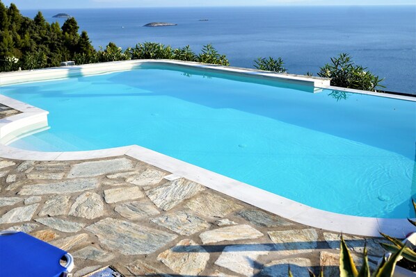 - Una GRANDE TERRAZZA panoramica con seduta perimetrale , dove abbiamo avuto anche l'onore di ospitare la scuola di danza popolare Skopelos completa con orchestra patrocinato dagli ospiti. In quell'occasione abbiamo approfittato della cucina all'aperto completamente coperta adiacente alla GRANDE TERRAZZA con forno a legna e barbecue, lavello e fornelli a gas, la stanza frigoriferi e 2 bagni esterni dedicati a queste occasioni.