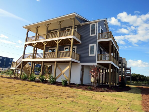When we were looking for a place it was tough to find property that was newer that allowed pets. The owner let me stay even though there was still some fine tuning being done on the new house. We were the first guests to stay. This property was Fantastic! The property manager met us at the house with the keys and personally showed us around. The house has great ocean views and views of the sound from the decks on three sides. You can see, hear, feel and smell the ocean. The home has a huge yard that was great for the dogs. The yard wasn't fenced in yet, but the manager told me that was scheduled to be done within the next month. A convenient beach access was just a few houses down the street. Thank you for a wonderful stay!