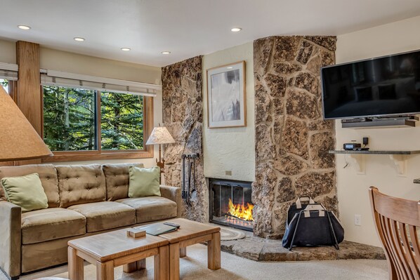 Second floor, upgraded studio condominium, accessible without stairs, just steps away from Snowmass Ski Area & our two-tier on-site hot tubs. This condominium includes a full kitchen, living room with a queen sleeper sofa, one attached bathroom, a queen bed in the bedroom, a balcony with a grill and a personal wood-burning fireplace. Sleeps up to four people comfortably. Laurelwood 207 offers a relaxing, spacious and cozy mountain retreat, regardless of the season.