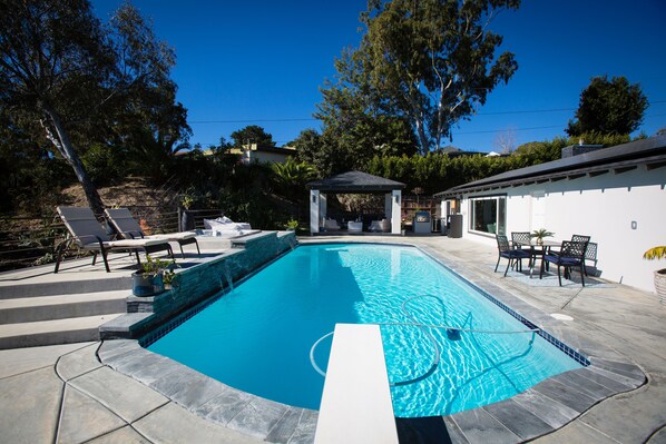 This Solana Beach home offers a perfectly placed sparkling pool & jacuzzi with spectacular panoramic views including a peak ocean view. Relax in the modern outdoor gazebo with built-in fire pit, or in one of the many loungers around the pool or jacuzzi. Sip your morning coffee or tea next to the water feature and enjoy a good book, take a dive into the pool, or engage in a fun game of afternoon darts. The home is private and comfortable with 2 Calif Kings and 2 Two double beds, plus Queen sized inflatable mattress for additional guests, luxuriously fluffy down comforters, natural wood beamed ceiling, family-sized wrap around sofa, large TV, cozy custom built stone faced gas fireplace, built-in outdoor gas grill, and two inside dining areas. You'll love the attention to detail and immaculate condition. This hideaway offers a truly unique and leisurely setting with beautiful views. Pool gas heating is available for an additional "per day" heating fee.