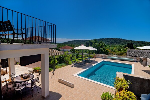 Accanto alla casa è coperto barbecue in pietra. Per l'intrattenimento e le vacanze attive, l'ampia piscina dispone di attrezzature da pallavolo da piscina.