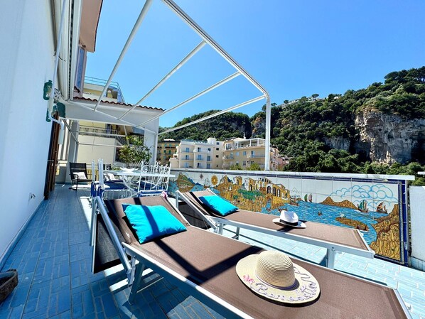 L'appartamento ha un'esposizione fantastica, con ampi balconi tutti con vista mare. La casa è di dimensioni generose e si compone di 3 camere da letto, soggiorno con sala da pranzo e angolo cottura, due bagni completi. Il punto focale è sicuramente l'ampia terrazza esterna vista mare arredata con grande tavolo in vietri, sei sedie, due lettini e diverse sdraio.