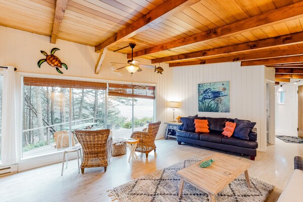 Dall'interno, amerete la vista sul mare dalla parete di questa casa di finestre! Fare qualche tempesta a guardare in un pomeriggio d'inverno freddo, mentre la stufa del propano tiene tutto dentro caldo e caldo, o vedere un tramonto mozzafiato estate dopo cena. Ci sono un sacco di comodi divani per tutti di sedersi dopo una giornata di escursioni, giocando sulla spiaggia, o vagando le mostre presso l'Oregon Coast Aquarium. E se è troppo piovoso per godersi la vita all'aria aperta, c'è la TV via cavo, un lettore DVD, e Wi-Fi per l'intrattenimento a casa.