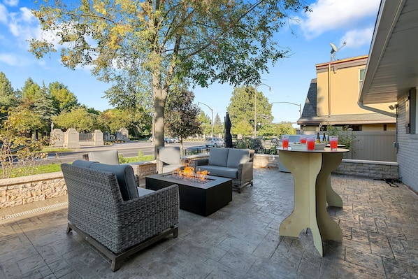 This home’s front patio is the ideal place to relax and entertain, adding that special touch to your stay across from Notre Dame.