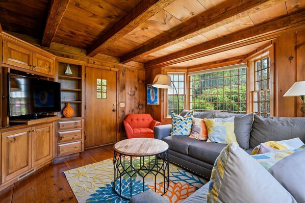Pass by the formal entry at the front of the home and you are in the living room. There is plenty of comfortable seating for everyone to enjoy their favorite content on the flat screen TV mounted above the fireplace and beneath the same beamed ceiling of the dining room. Both rooms are accented in bright coastal hues and fleeting pops of orange that extract the warmth of the surrounding wood features in this home.