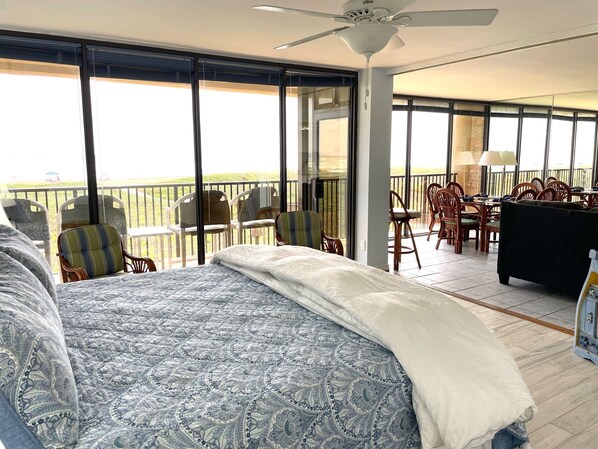 The perfect beach vacation awaits you in our beachfront 3 bedroom/2 bath condo located in the well maintained, gated beachfront Sea Vista complex located next to the Beach Park at Isla Blanca (formerly Schlitterbahn Beach and Water Park). The Sea Vista complex offers 2 swimming pools and hot tubs, 2 tennis/pickle ball courts, charcoal grilling station, free secure on-site parking and direct private access to the beach, just steps from your door. Our beachfront 2nd. floor condo has inside elevator access. Once you walk in the door, there is nothing but dunes, beach and sea...all for your enjoyment. The living/dining area and the master suite have wall-to-wall, floor-to-ceiling windows with the most amazing view of the Gulf of Mexico. Imagine waking up after a restful night of sleep to a magnificent sunrise...it just doesn't get any better than that!!! This same view can also be enjoyed from the kitchen while preparing that gourmet meal. Relax on the spacious balcony sipping your favorite beverage and feeling the gulf breezes while watching the ships and shrimp boats come and go or the occasional pod of dolphins play in the surf. The beachfront master suite has a king size bed and a small sitting area. The en-suite has a tub/shower combination and a quartz countertop vanity. The second bedroom also has a king size bed and a twin size trundle bed. This bedroom comfortably sleeps 4. The third bedroom has 2 queen size beds and can comfortably sleep 4 as well. The two guest bedrooms share the guest bathroom which has a walk-in shower and a quartz countertop vanity. All 3 bedrooms have their own dressers, closets, large flat screen TVs and sitting areas. The bedrooms and bathrooms are outfitted with luxury linens and towels. We also provide a Pack-N-Play for your little one. Paper products and soaps are provided to get you started, even shampoo and conditioner. The kitchen, with a quartz countertop has a range, microwave, dishwasher, and a refrigerator with ice maker. It is stocked with high quality dishes, glassware, flatware, pots and pans and a starter supply of herbs and spices. As well as several small kitchen appliances to enhance your cooking pleasure. Paper towels and trash bags are supplied to get you started and there are some cleaning supplies. To increase your vacation pleasure, there are 4 large flat screen TVs with Spectrum cable and free password protected WiFi. The condo is fully air conditioned and has 4 ceiling fans...1 in each bedroom plus the living/dining area. A full size washer and dryer are conveniently located inside the condo. A starter supply of laundry products is provided. For your beach time enjoyment, we provide beach towels, beach chairs, a beach umbrella, boogie boards and some sand toys to build that amazing sand castle. As a guest of Sea Vista you may purchase discounted Beach Park at Isla Blanca (Schlitterbahn) tickets available only through the Sea Vista office during the summer. There are many good restaurants and bars located nearby, many within walking distance. The dolphin-watch boat rides leave from the nearby pier on the west side of Padre Blvd. Relax and enjoy your vacation.