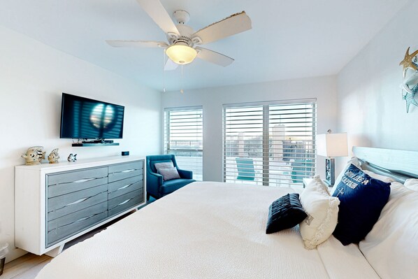 Take in stunning Gulf of Mexico views from the master bedroom’s large, sun-filled windows, or grab a book from the shelves and stretch out on the king bed. This bedroom also provides a smart TV and an en-suite bathroom with granite countertops and a glass walk-in shower.