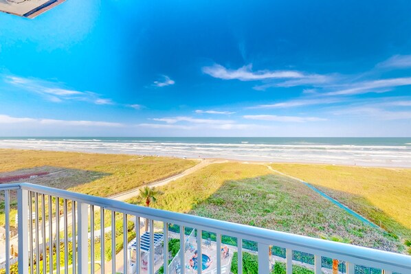 Gulf-front getaway with beach views, AC, heated pool, hot tub, gym