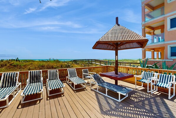 Relax on your private patio-- steps away from the heated pool, hot tub, and beach. The covered space is complete with four chairs.