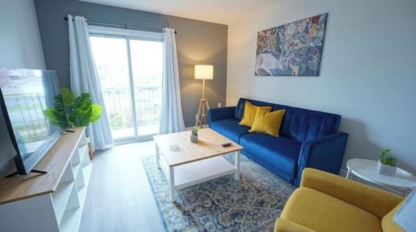 Our living rooms are an open concept space with a full patio door and private balcony. Open the patio door and let the fresh St. Lawrence breeze fill the room while you relax and enjoy the