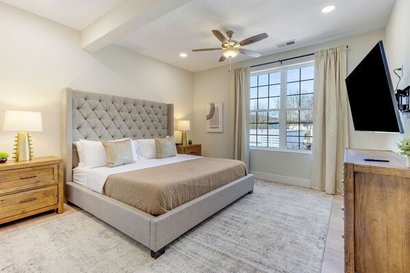 ☆ Bedroom 3 is a primary bedroom with a queen-size bed and an extra large en-suite bathroom with a walk-in shower and double sink.