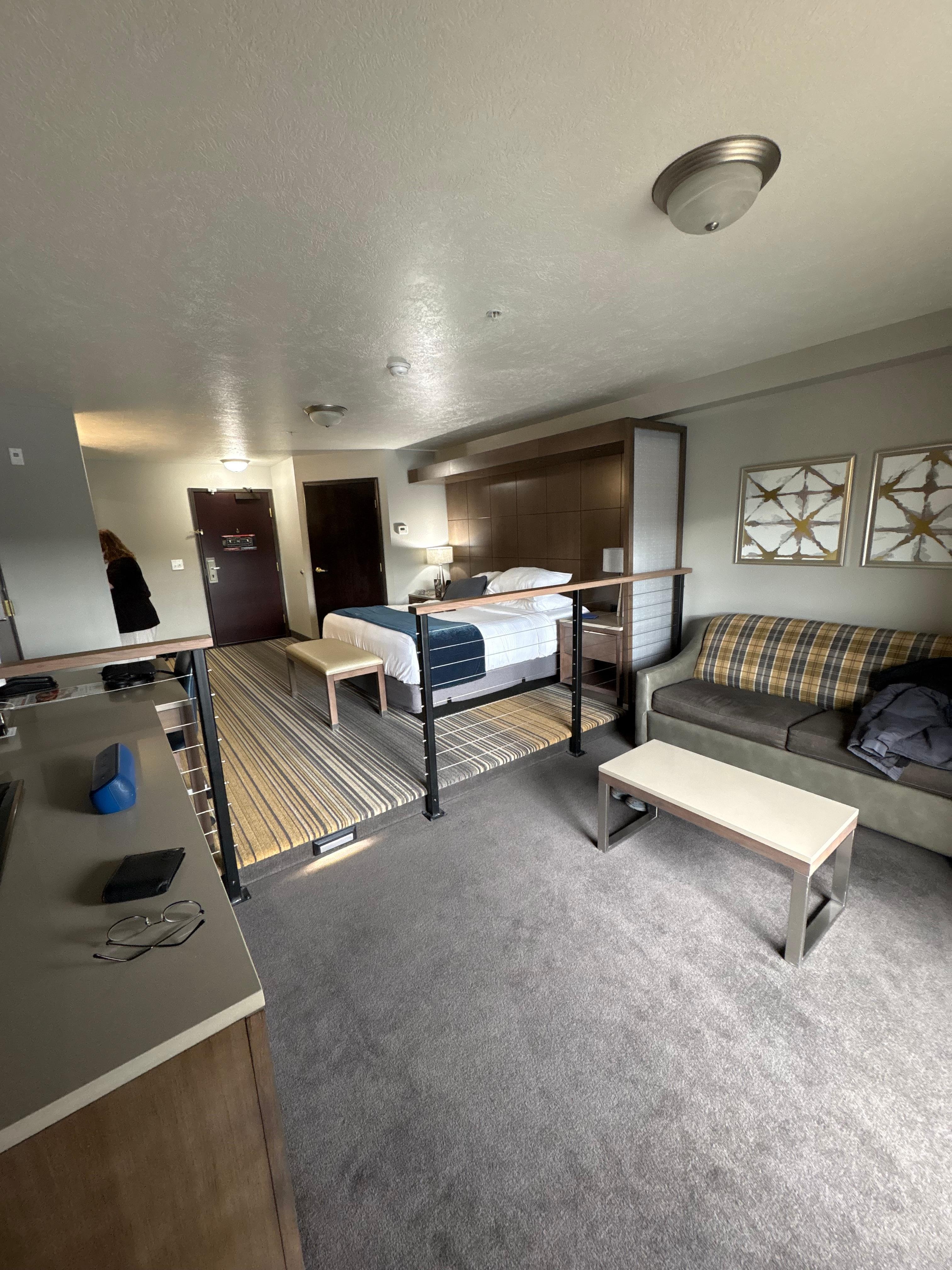 The room was great, executive suite with a balcony. The breakfast selection is good, if you get there early enough. Coffee not available 24 hrs. In room water boiler pitcher for steeping coffee was not ideal. Limited pool hours, 9am to 10pm, did not work for us. There was a lot of pool patrons and the pool and spa are small. Our room neighbors left their garbage and food tray outside their doors, dirty glasses left on the table at the end of the hall. Not really the hotel’s fault, but if staff isn’t on the floors until the next day for room cleaning, then the trash sat all night. The guests should have taken their trash/food tray downstairs rather than leaving it outside their doors. We won’t stay here again.